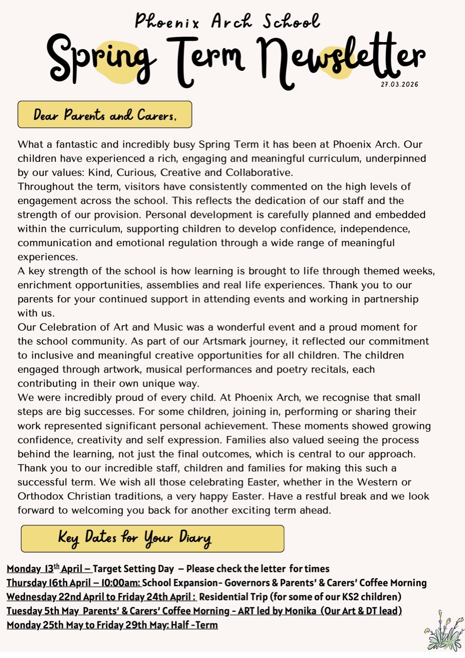 Engagement is a valuable way of showing your child how closely you are working with the school to support their learning. At Phoenix Arch we provide many opportunities for our families to get involved with school life. We run a variety of parenting programmes and subject specific drop-ins in order for our parents to feel confident to support their child’s learning and behaviour. By working together we build a bank of strategies and develop our school community.